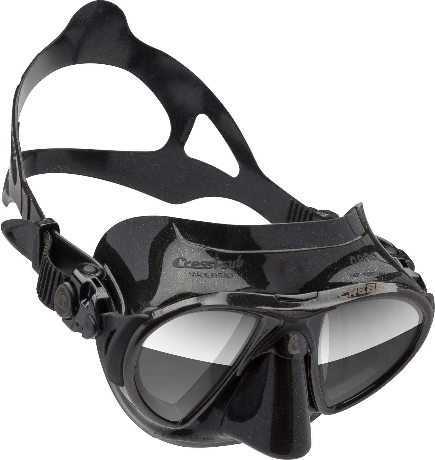 The internal volume is minimal and does not require intentional equalizing. The swiveling buckles feature micrometric regulation. Angled tempered glass lenses and an anatomical strap.