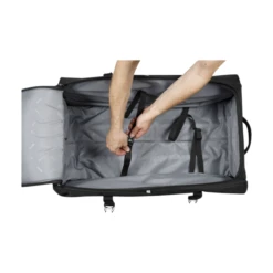It features large sturdy wheels, a telescoping handle, incorporated front