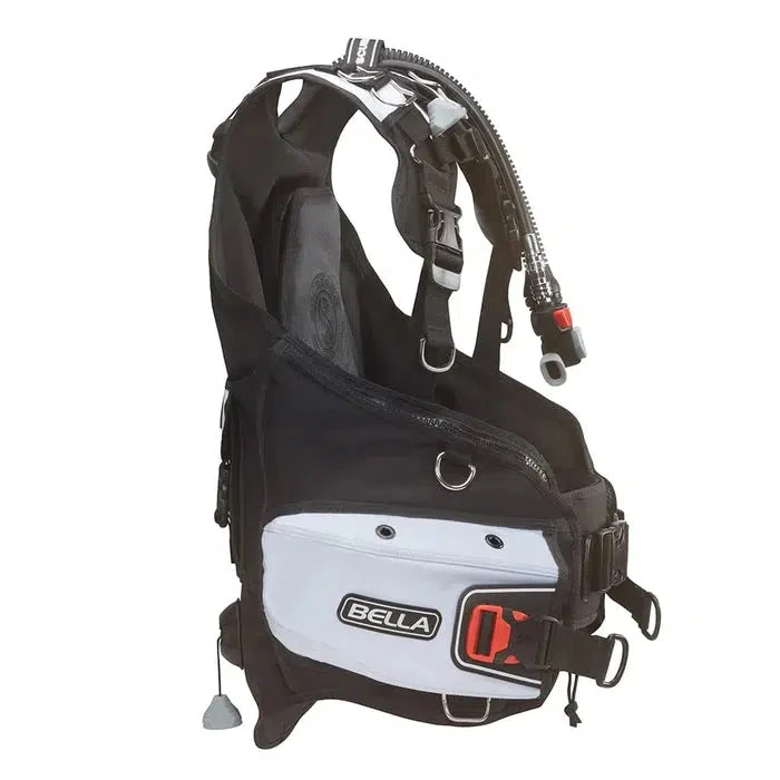 The Scubapro Bella Buoyancy Compensator Device BCD, The Bella is designed and tailored for female divers who prefer the comfort and security of a full-featured, front-adjustable BCD. Restyled for 2023, the Bella features new larger cargo pockets, a new integrated weight system design, upgraded backpack padding and a striking white color scheme.